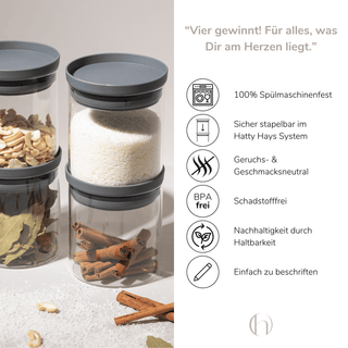 Mundgeblasene Vorratsgläser aus hochwertigem Borosilikatglas.