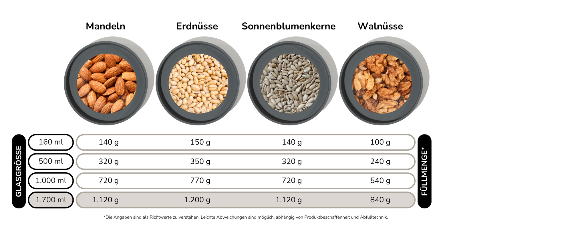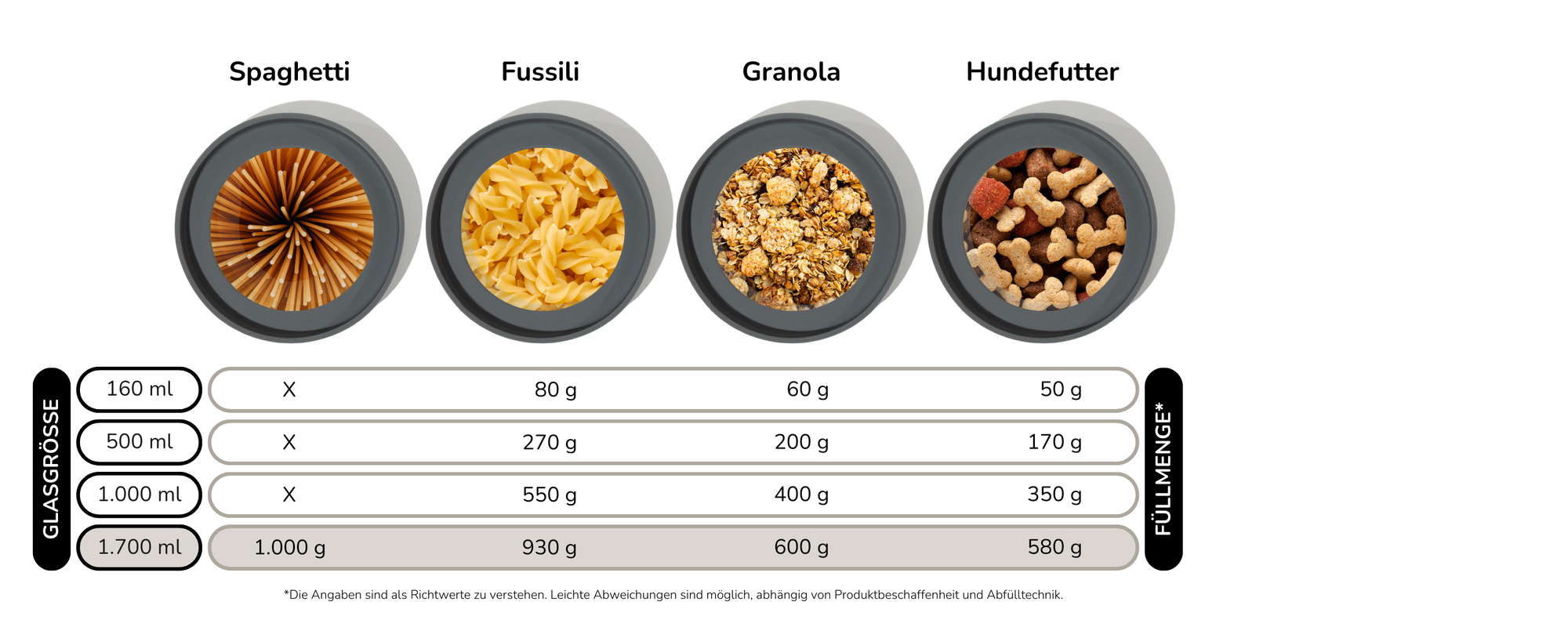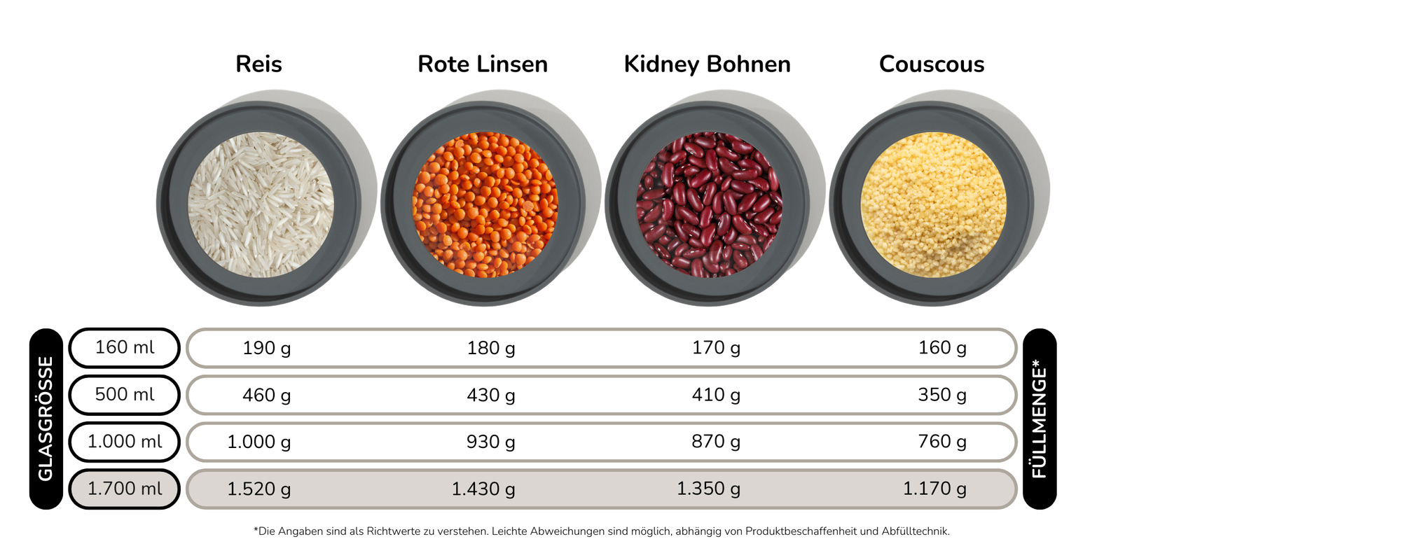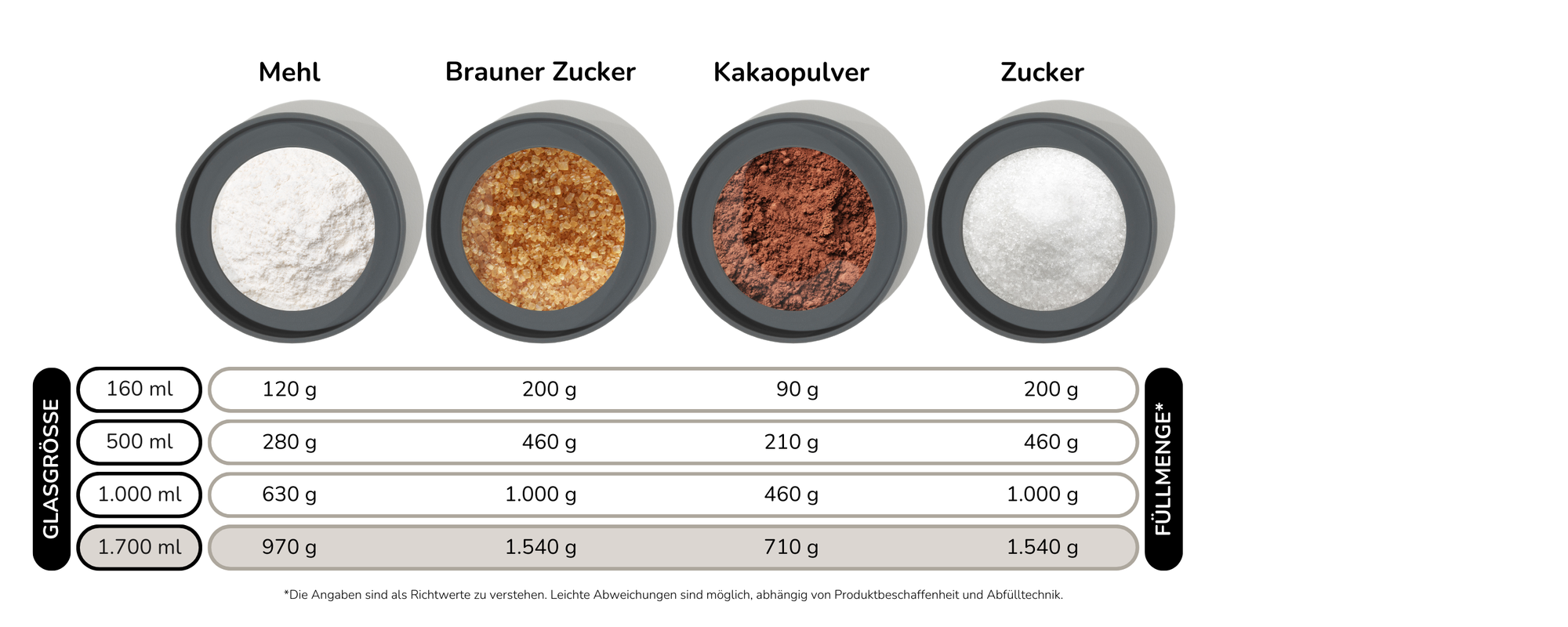 Hinweis: Für ein volles 1kg Mehl „mit Luft nach oben“ empfehlen wir unsere 2.200ml XL-Variante.