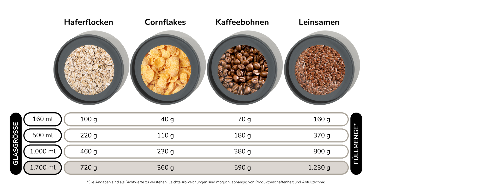 - Müsli: Perfekt für ca. 600g Granola oder Cornflakes.