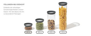 Unsere hochwertigen Vorratsgläser aus robustem Borosilikatglas halten Deine Lebensmittel länger frisch und bieten Schutz vor Feuchtigkeit und Schädlingen. Der luftdichte Silikondeckel mit integrierter Glasscheibe ermöglicht es Dir, den Inhalt mühelos zu überprüfen, ohne das Glas öffnen zu müssen. Mit verschiedenen Größen erhältlich, passen unsere Gläser perfekt für alle Deine Aufbewahrungsbedürfnisse – von Gewürzen bis hin zu größeren Mengen Mehl oder Nudeln.