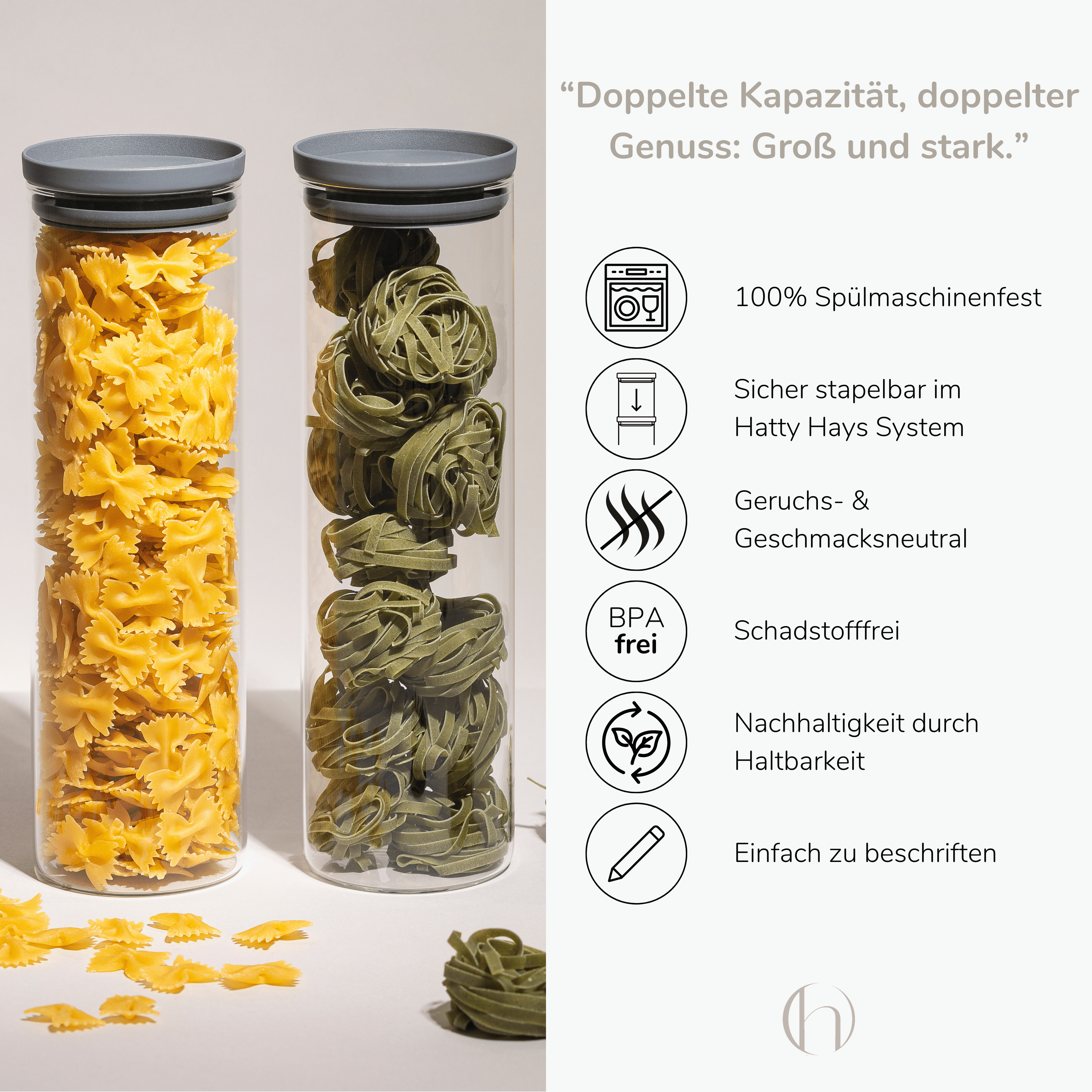 ✔️ DEKORATIV UND PLATZSPAREND – die stapelbaren Vorratsgläser haben ein elegantes Design und die Glasdosen eignen sich perfekt zur Organisation jeder Küche. Aufgerissene Tüten gehören der Vergangenheit an.