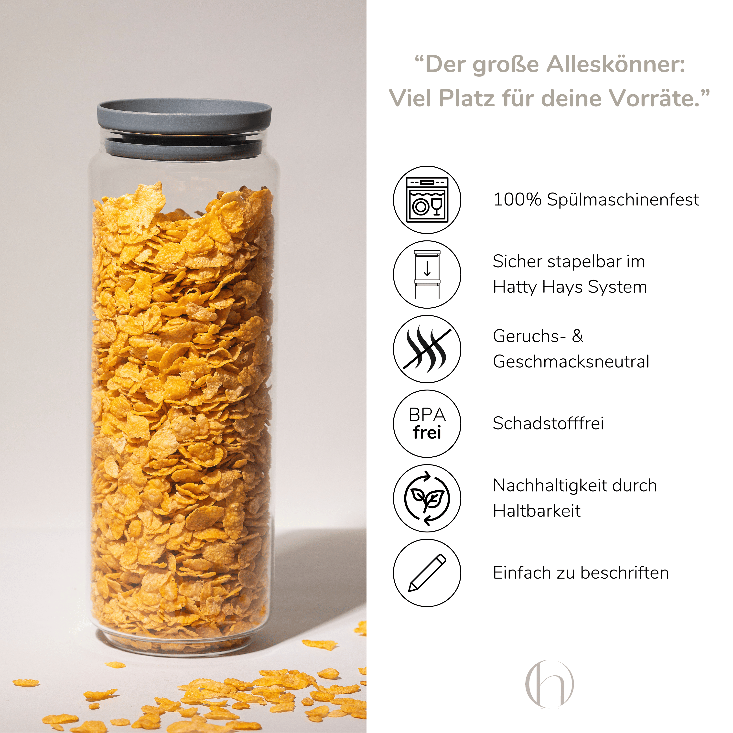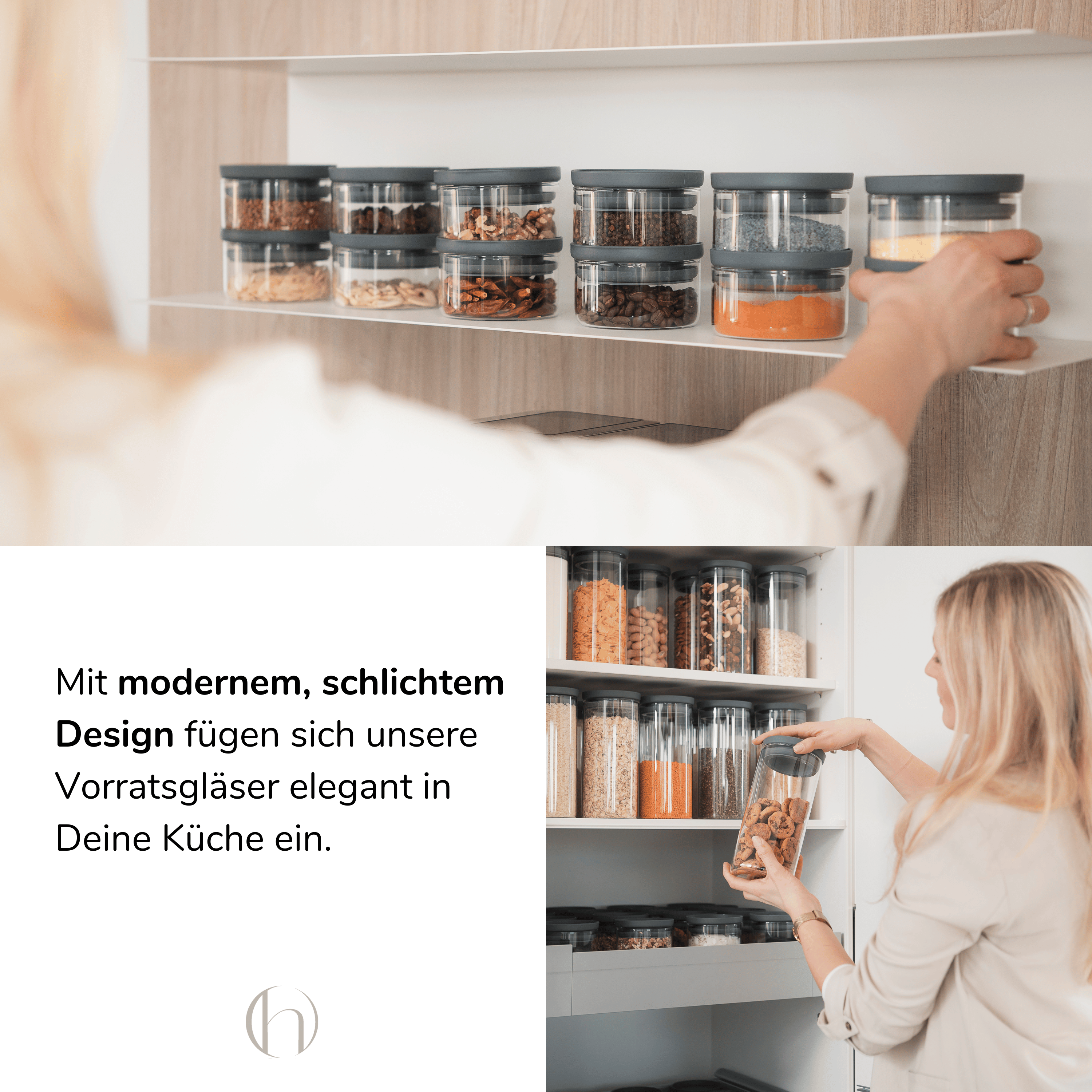 ✔️ DEKORATIV UND PLATZSPAREND – die stapelbaren Vorratsgläser haben ein elegantes Design und die Glasdosen eignen sich perfekt zur Organisation jeder Küche. Aufgerissene Tüten gehören der Vergangenheit an.